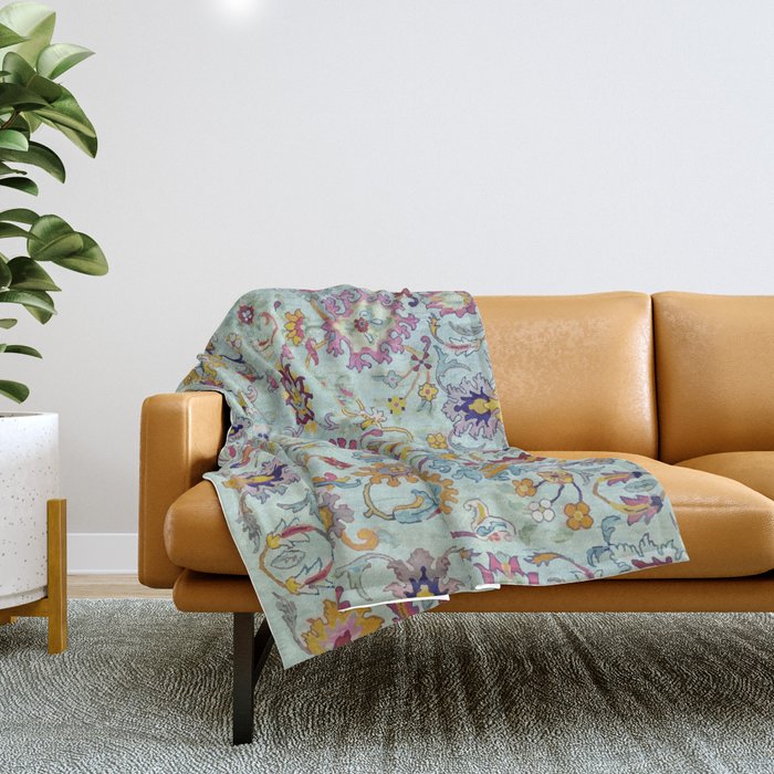 Turkish Oushak Blue Floral Rug Pattern Throw Blanket